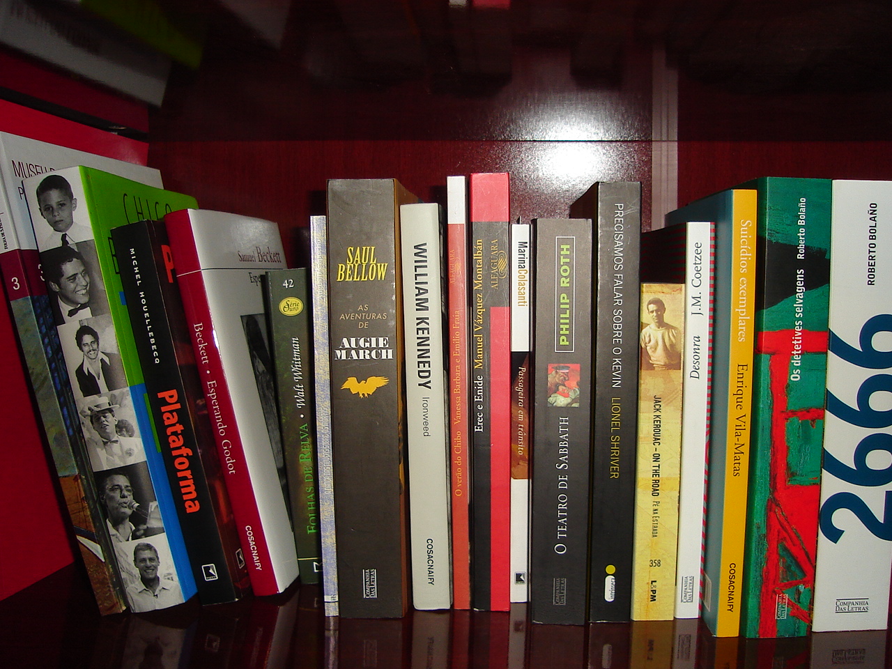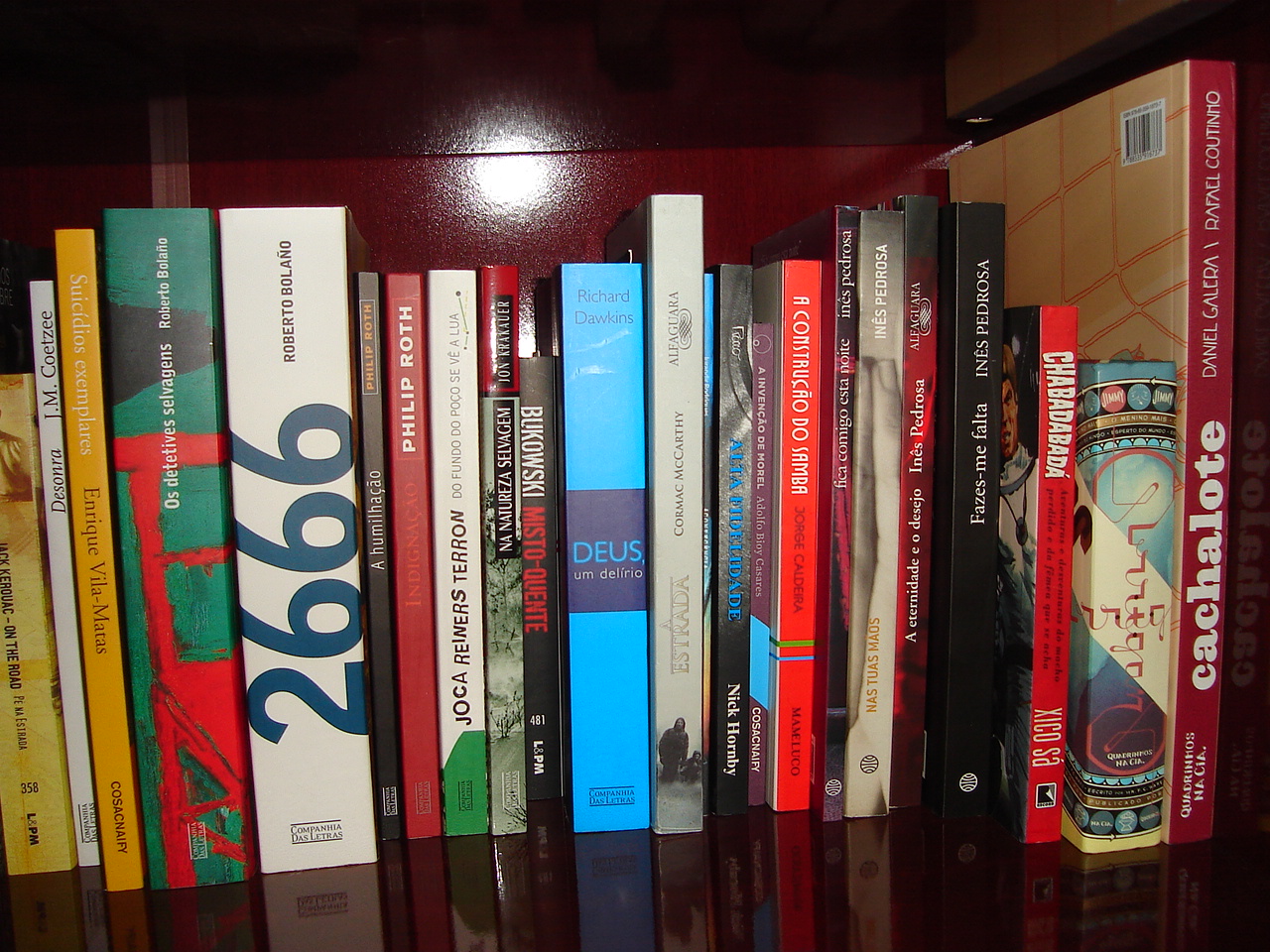 Nessa foto, vemos alguns de seus livros. Destacam-se ali o Desonra, do JM Coetzee, na novíssima edição luxuosa; Suicídios Exemplares, do Vila-Matas; A Humilhação e Indignação, do Philip Roth; a Invenção de Morel, do Bioy Casares (esse não tenho); Bolaño, só os maiores; Na Natureza Selvagem, que virou filme (não tenho); alguns da Inês Pedrosa (também não tenho), algum sucesso de vendas do dr. Richard Dawkins (não); o quadrinho Cachalote que, francamente, não entendi muito, e o maravilhoso Chabadabadá, do macho-jurubeba Xico Sá.