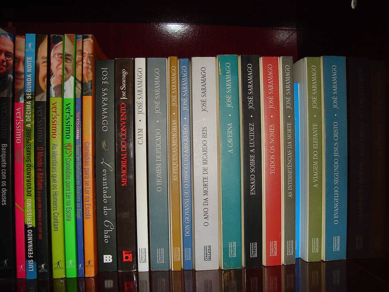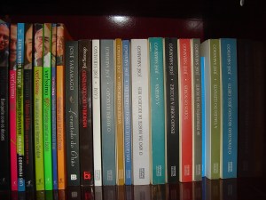Eis aqui algumas pequenas grandes coleções: Luis Fernando Verissimo e Saramago. Os títulos ali incluem uma edição antiga de Memorial do Convento, e os livros que partilhamos: Todos os Nomes, a Viagem do Elefante, as Pequenas Memórias, As Intermitências da Morte, Don Giovanni e O Evangelho Segundo Jesus Cristo. Alright!