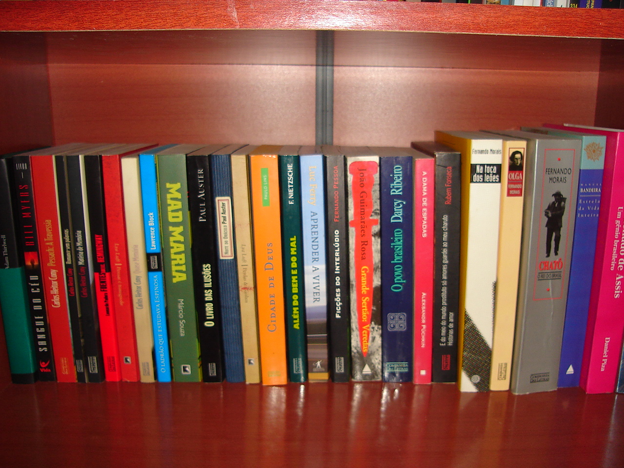 Aqui a coisa começa a ficar confusa. Darcy Ribeiro, Lya Luft, Cony, Adam Thirlwell, Nietzsche, Luc Ferry, Paul Auster e uma edição da idade do Bronze de Grande Sertão Veredas, ao lado de uma pequena coleção de títulos do Fernando Morais. Pô, sujeito, que mistureba! Se decide aí!