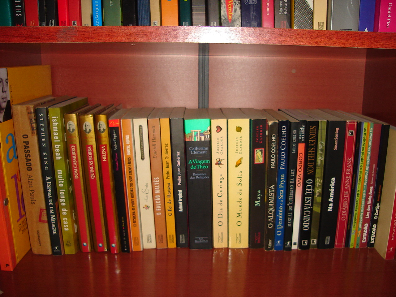 Pra terminar, uma metade mística-filosófica da estante com A Viagem de Theo, vários de Jostein Gaarder, Paulo Coelho (cof cof) e uma não tão simpática coleção do Estadão. Da outra metade, a preciosidade O Rei de Havana, Marçal Aquino, Machado de Assis, Thomas Eloy Martinez (o livro sobre a Evita), Alan Pauls e um almanacão do professor Pasquale porque ninguém nasceu sabendo!