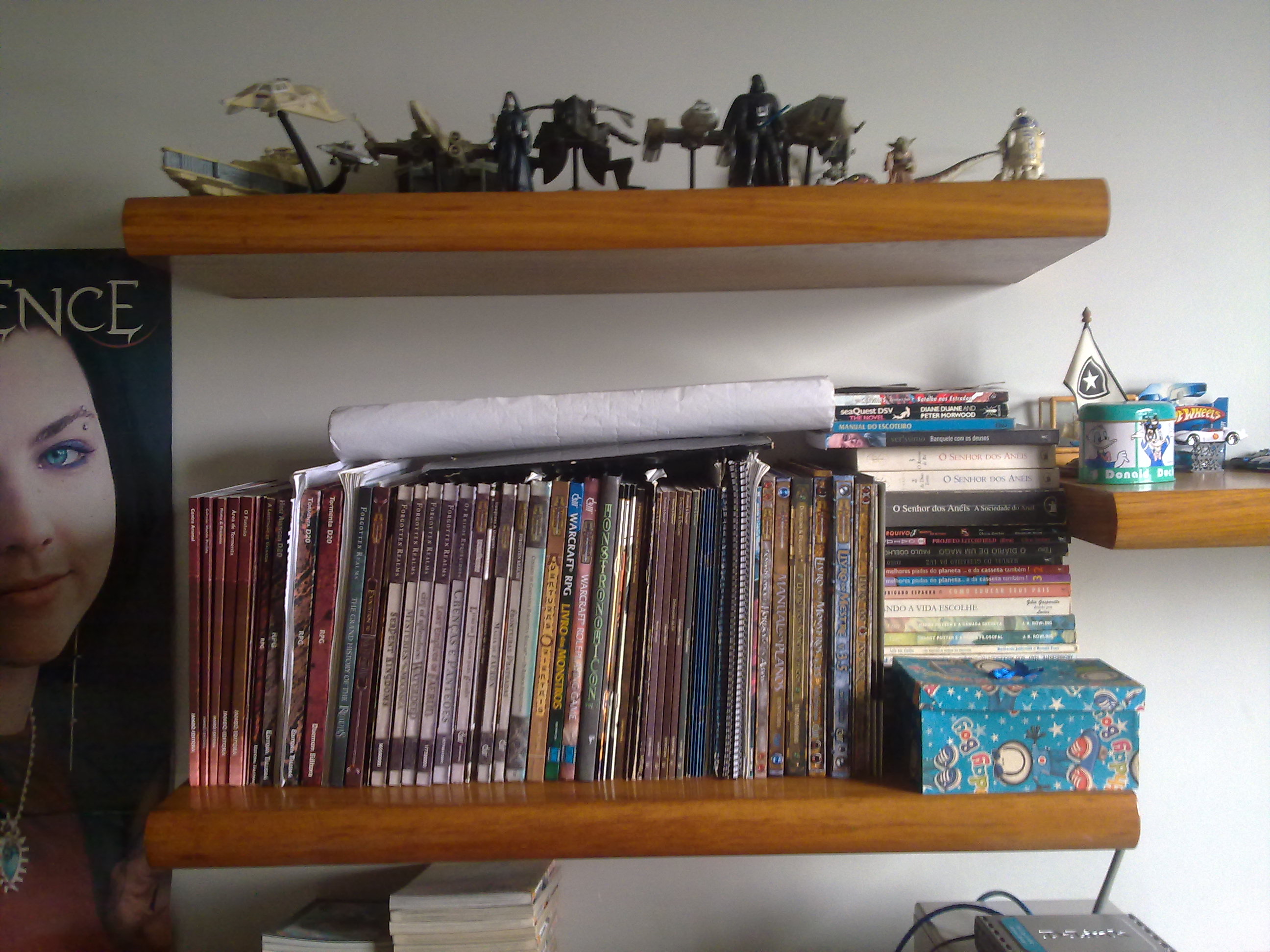 Enfim, aqui em casa as estantes ficam na sala, e tirei uma foto (que depois descobri que ficaram todas meio borradas, mas tô muito debilitado para tirar novas fotos… cof cof… tadinho de mim) pra vocês verem como é:
