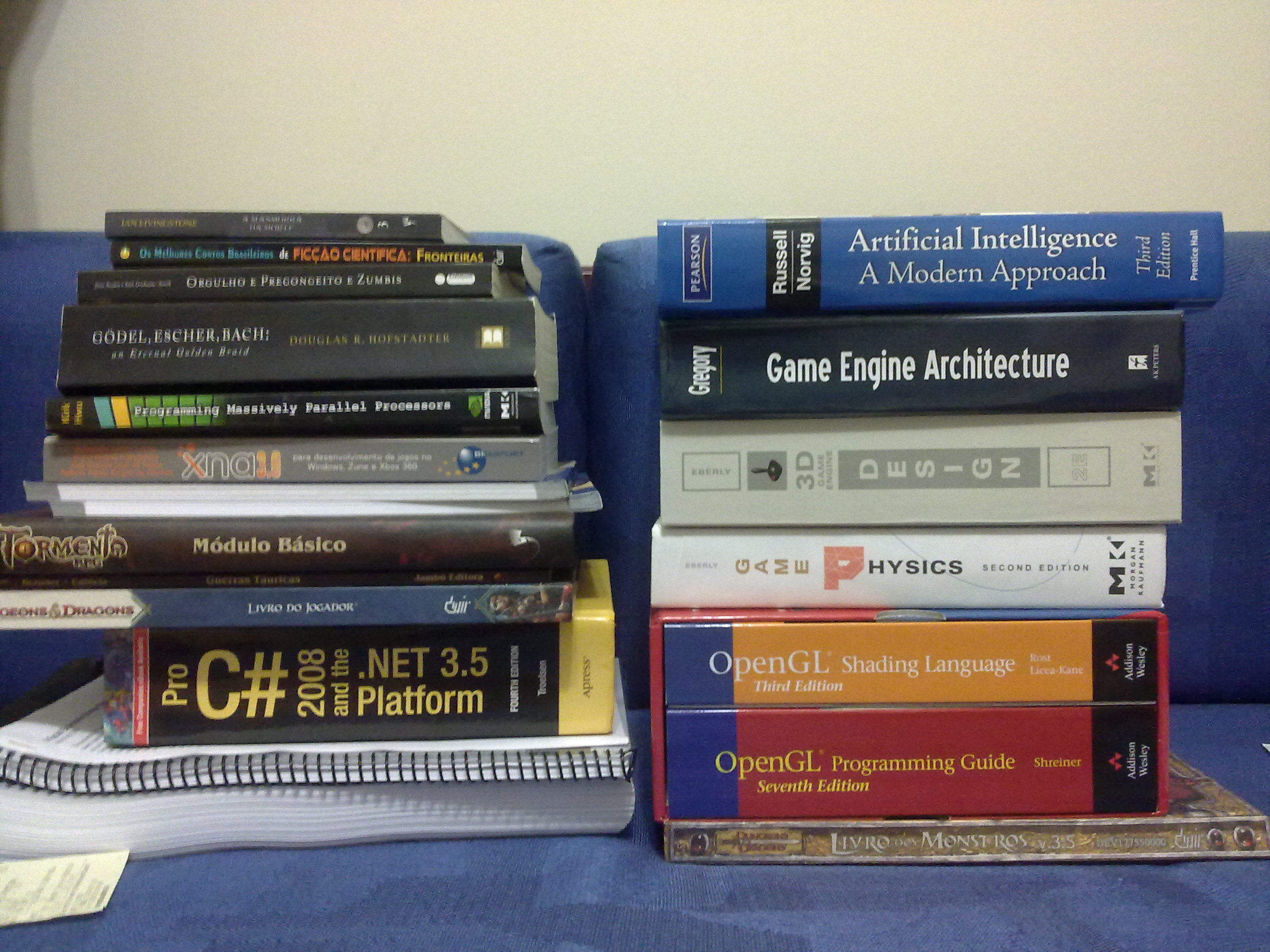 Vish, que preguiça que dá só de olhar pra esses livros. O Bruno está se especializando em desenvolvimento de jogos, rapaziada (me corrija se eu estiver errado), então tudo bem que tem um Tormenta e um AD&D ali no meio, né?