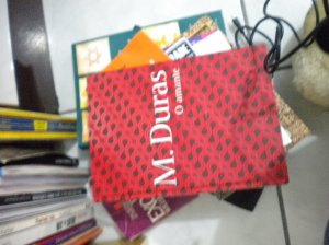 Aqui, em mais uma foto (ela me mandou várias, então tive que escolher) vemos mais um pouco do caos de sua (des)organização. Em destaque, o livro O amante, da Marguerite Duras, parte da coleção das mulheres modernistas, o Exorcista (que medo!) e mais uma porrada de livros encostados. Punk’s not dead!