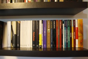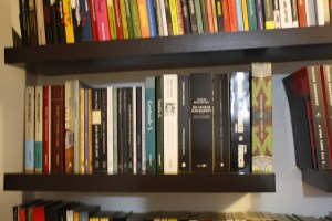 A estante superior direita tem bons títulos também: Stanislaw Ponte Preta, Leonardos Sciascias, Vargas Llosas, Rosas Monteiros, Fernando Vallejos, Kunderas, Pedros Juans, Rubens Fonsecas, Kadarés, Valêncios Xavieres, Stieg Larssons, Cacos Barcellos, entre outros.