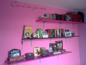 A Lálika, do blog Elo Amarelo, tem prateleiras de parede com cavaletes de suporte, e escreveu “Come as You Are…” numa parede totalmente pink. Entre seus livros tem porta-retratos, porta-lápis e várias caixinhas que eu imagino que sejam para guardar joias. Entre seus títulos, é possível ver uma pequena coleção do Fernando Morais, uma mega coleção do Harry Potter, alguns livros do professor Dawkins, Zuenir Ventura, Mafalda e Rolling Stones. Ela disse que o quarto dela foi reformado e isso tudo aí já mudou, e que uma das estantes caiu.