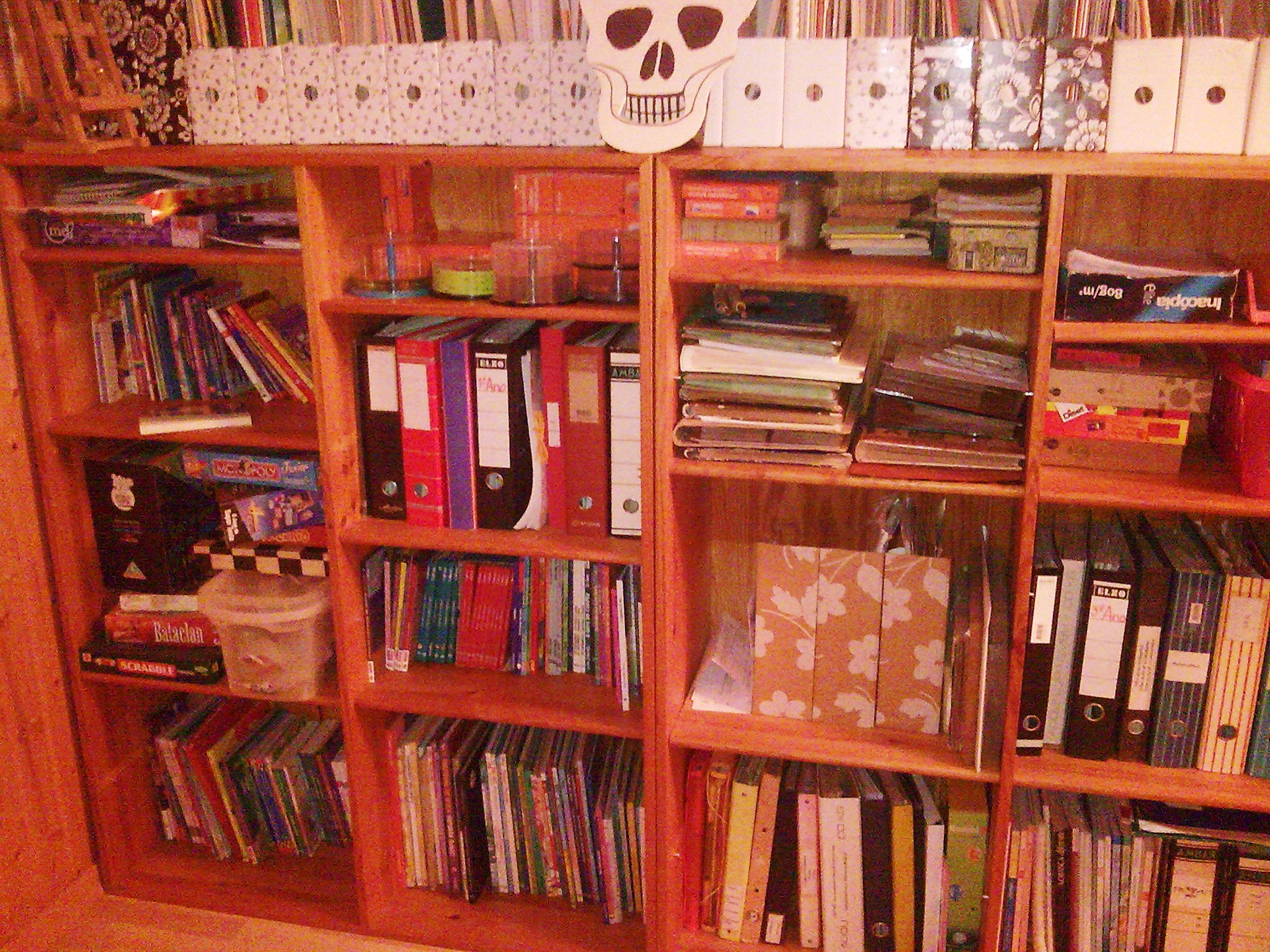 Fala sério hein, se você tivesse metade da organização dessa estante na sua vida você não estaria atolado de problemas. Os fichários são documentos da mãe das meninas e esposa do Fausto, que é professora primária.