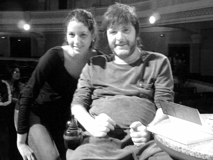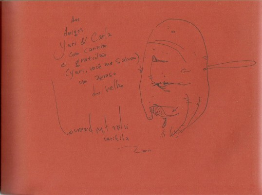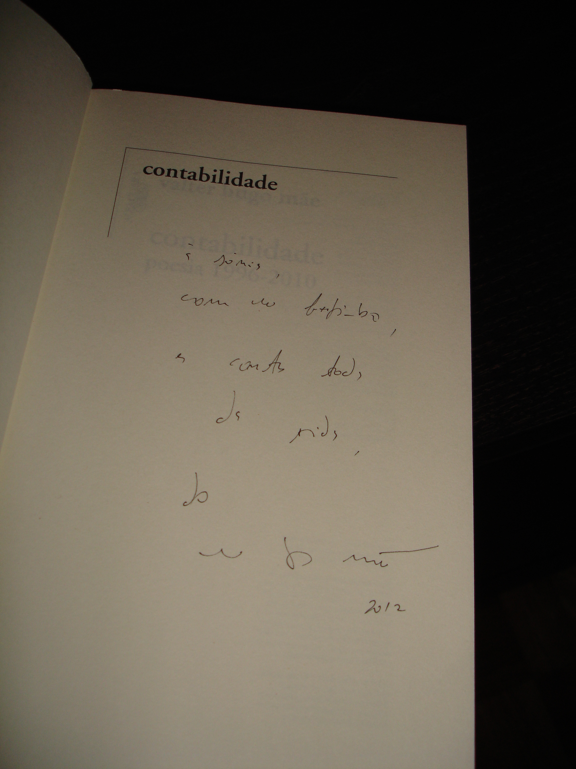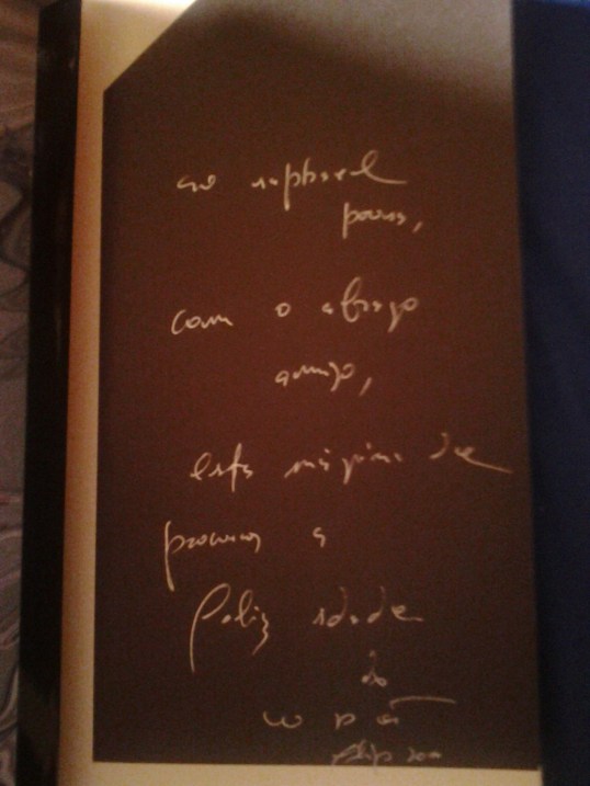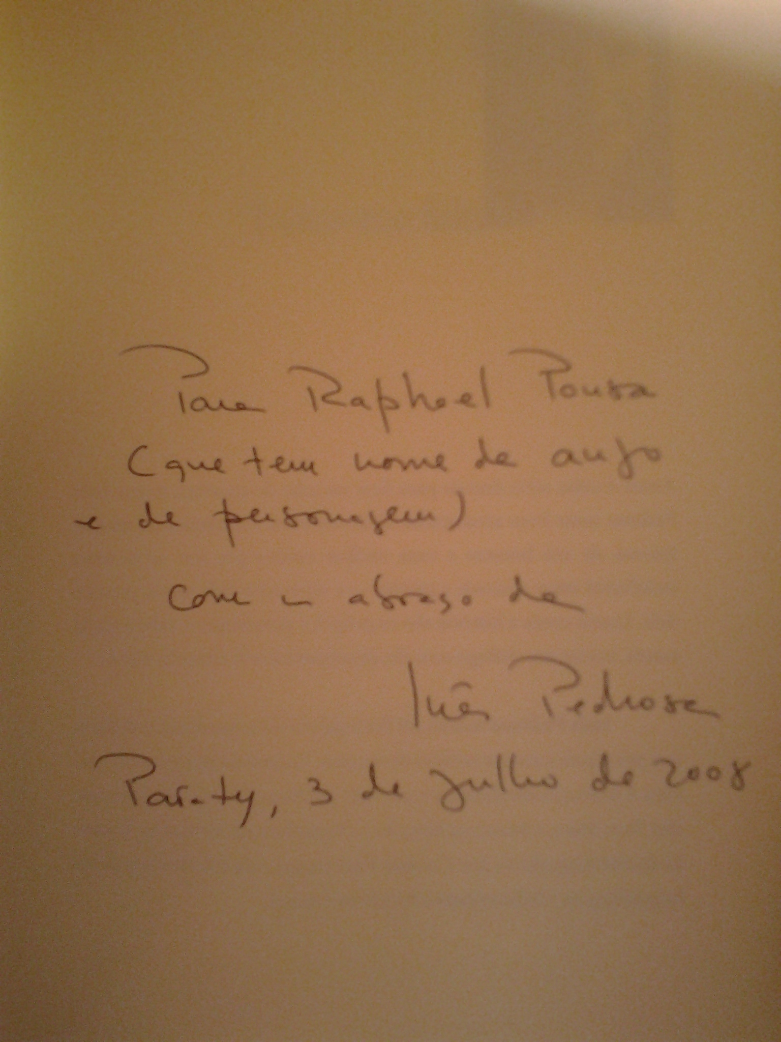 O Pousa também foi lá bater um papo com o Hugo Mãe. Diz lá “Ao Raphael Pousa, com o afrijo anjo leste origami (?) de Prowing…” quer saber, mano? Desisto de tentar ler autógrafo desse senhor, que chateação, sô!