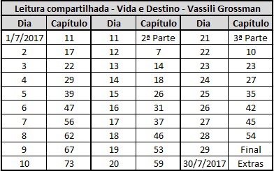 Faltam apenas cinco dias para o início da leitura coletiva de Vida e Destino, e as solenidades preliminares fazem jus ao tamanho da obra. Não é todo dia, afinal, que mando vocês leitores encararem um tijolo de 900 páginas. Faço isso no máximo uma vez por ano e nunca nada tão grande. Mas calhou de ser este o escolhido para a categoria mandatória do Desafio Livrada! 2017, no qual espero que todos estejam se saindo bem até o momento. Vamos, com este post de hoje, dar o primeiro tiro de aviso a você, que já botou um pé para dentro da cerca do galinheiro e já pensa em fugir com as galinhas e os louros da fama sem ao menos se dar conta do que tem em mãos no momento. Arruma um exemplar e se prepare porque dia 1 de julho começamos esta longa jornada, com as instruções e o incentivo da querida Isa, do Lido Lendo, que a essa altura, espero, já deve ter soltado o vídeo sobre a leitura. Desde já o que posso adiantar para vocês é: fiquem ligados no canal do Livrada! e compartilhem impressões usando a hashtag #lendovidaedestino. Se puder dar uma força na imagem abaixo, também seria massa.