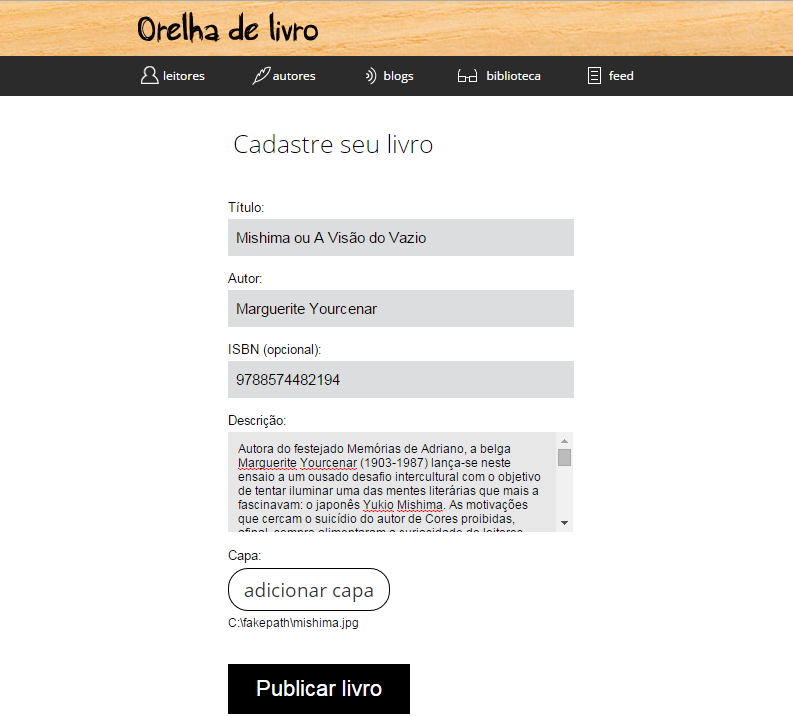 Aí com o livro na estante, dá pra fazer o diabo. Resenha, comentário, dar estrelinha, faz teu show, ou não faz. Fica peixe e aprende. O papai aqui queria ver também como funcionava o cadastro de livro porque rede social tem que ser colaborativa e pra ser colaborativa tem que ser sem enrolação. Cadastrei o da Marguerite Yourcenar que tenho aqui e a coisa é mais mole que mastigar água de cabeça pra baixo, olhaí: