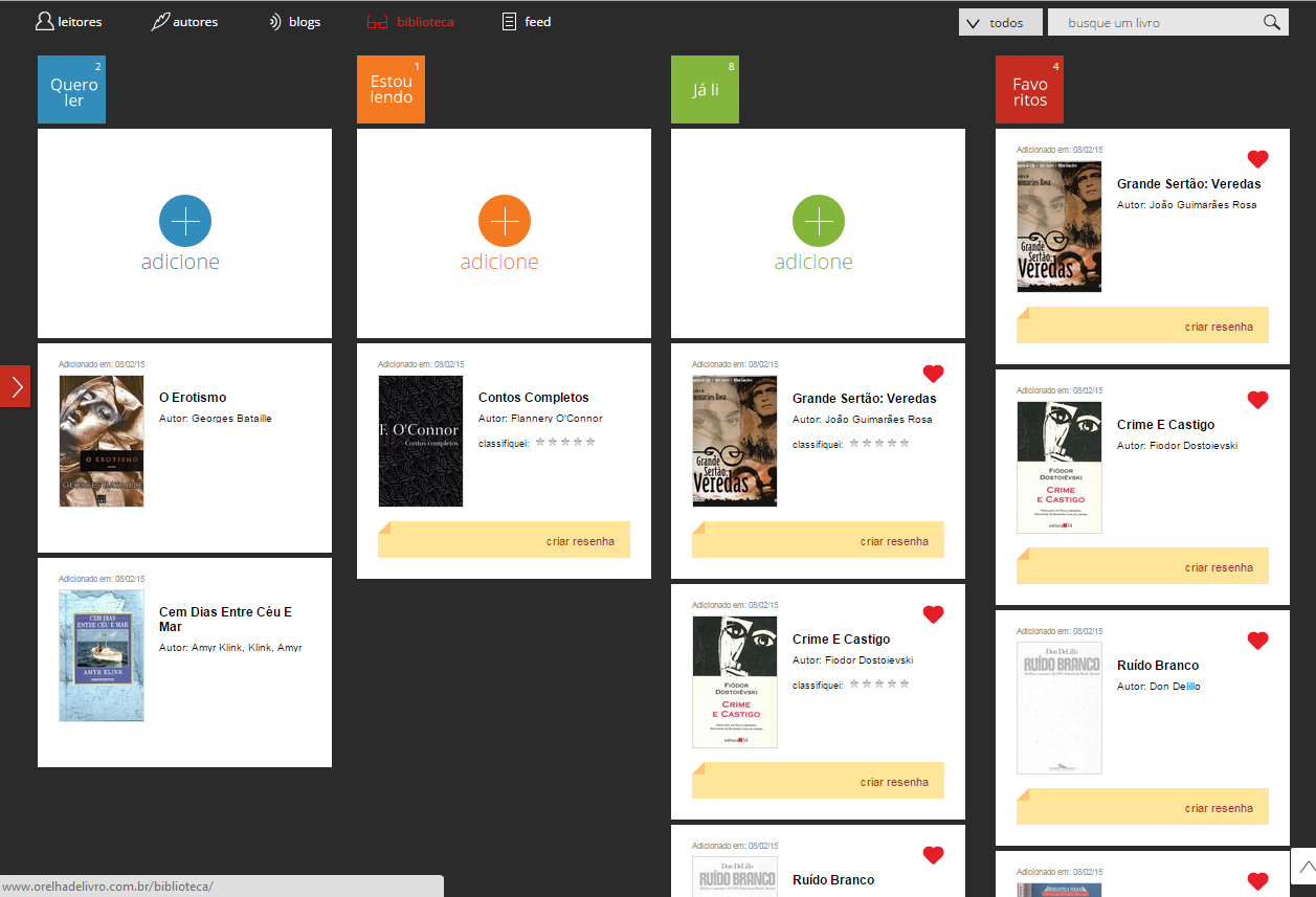 Eu sei que nós, beletristas e leitores de ocasião, passamos muito tempo enfurnados entre páginas brancas, amarelas e carcomidas pelo tempo e raramente paramos para cheirar as flores dessa rede mundial de computadores, de modo que muitos de vocês talvez estejam me perguntando que diabos é uma rede social de livros (e aos que estão me perguntando o que é uma rede social em pleno 2015, peço a gentileza de regressar a seus devidos sarcófagos). Pois bem, o Orelha de Livro é muito similar a uma rede social no estilo do Facebook, onde você tem o seu perfil, com as suas coisinhas, e um feed de notícias, com atualizações do seu perfil e do perfil de amigos/seguidores. A diferença é que o assunto aqui é livro, e a rede abre um espaço para que você monte a sua estante virtual, cadastrando livros em categorias como “já li”, “estou lendo”, “quero ler” e “favoritos”. As categorias são autoexplicativas e a navegação no site é bem intuitiva também. Aprende essa, LinkedIn.